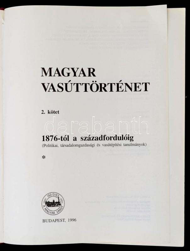 Magyar Vasúttörténet 2. kötet: 1876-tól a századfordulóig. (Politikai, társadalomgazdasági és vasútépítési tanulmányok.) Bp.,1996, Közlekedési Dokumentációs Kft. Kiadói aranyozott műbőr-kötés, jó állapotban.