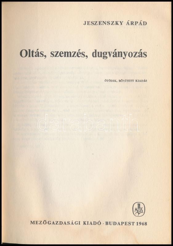 Jeszenszky Árpád: Oltás, szemezés, dugványozás. Bp.,1968, Mezőgazdasági. Ötödik, bővített kiadás. Kiadói papírkötés, kiadói szakadt, hiányos papírborítóban, belül jó állapotban.