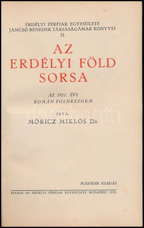 Móricz Miklós: Az erdélyi föld sorsa. Az 1921. évi román földreform. Erdélyi Férfiak Egyesülete Jancsó Benedek Társaságának Könyvei II.) Bp., 1932, Erdélyi Férfiak Egyesülete, 216 p.+ 2 térkép melléklettel. Kiadói aranyozott egészvászon-kötésben, kissé kopott gerinccel, jó állapotban.