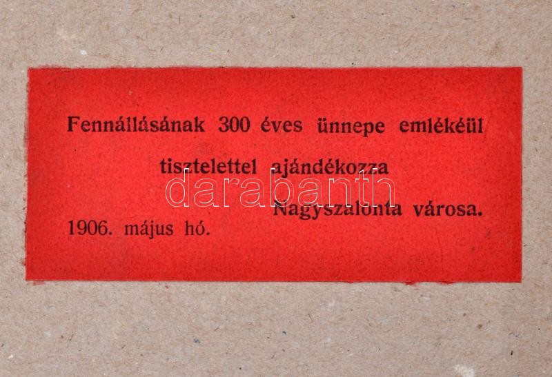 Nagyszalonta 1606-1906. Szerk.: Dr. Móczár József. Nagyszalonta, 1906, Székely J. Jenő, 1 t. (címkép)+ [2] + IV + 3-282 p. Kihajtható festett, aranyozott, dombornyomott egészvászon-kötésben, kopottas, foltos borítóval, restaurált kötéssel, néhol kissé foltos lapokkal, Arany János levelének kihajtható hasonmása hiányzik, Leventekönyvtári bélyegzővel. 'Fennállásának 300 éves ünnepe emlékéül tisztelettel ajándékozza Nagyszalonta városa. 1906. május hó.' címkével az elülső kötéstábla belsején.