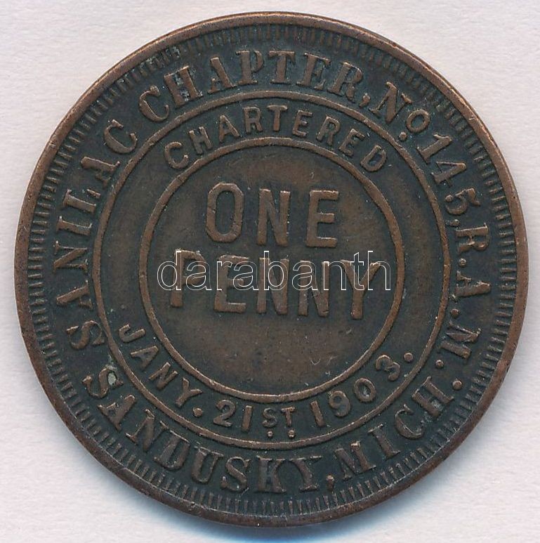 Amerikai Egyesült Államok 1903. 1p Br szabadkőműves zseton "Sanil... https://www.darabanth.com/de/324-Fernauktion/324.0/Numismatik/Notgeld-aus-Papier-und-Metall~2500006/Amerikai-Egyesult-Allamok-1903-1p-Br-szabadkomuves-zseton-Sanilac-Chapter-T2-USA-1903-1-Pe~II1801317