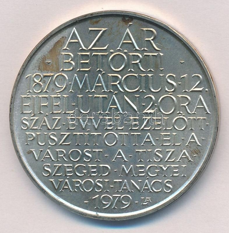 Lapis András (1942-) 1979. "Az ár betört! 1879 Március 12 éjfél után 2 óra - Száz évvel ezelőtt pusztította el a várost a Tisza - Szeged Megyei Városi Tanács" jelzett Ag emlékérem (34,93g/0.835/42,5mm) T:1- patina
