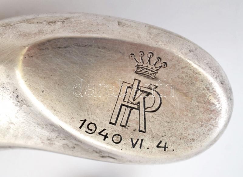 Beschreibung: cca 1940 Lovaglópálca, ezüst (Ag.) markolatvéggel, fa-bőr, jelzett, a markolatvégen koronás "P. K." monogrammal és "1940. VI. 4." dátummal, h: 83 cm