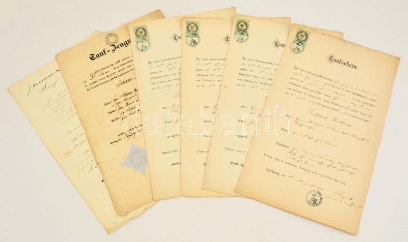 1853-1874 Pozsony, 6 db keresztelési igazolás, okmánybélyegekkel https://www.darabanth.com/de/325-Fernauktion/325.0/Andere-Sammelgebiete/Dokument~17/1853-1874-Pozsony-6-db-keresztelesi-igazolas-okmanybelyegekkel~II1807425