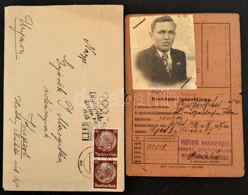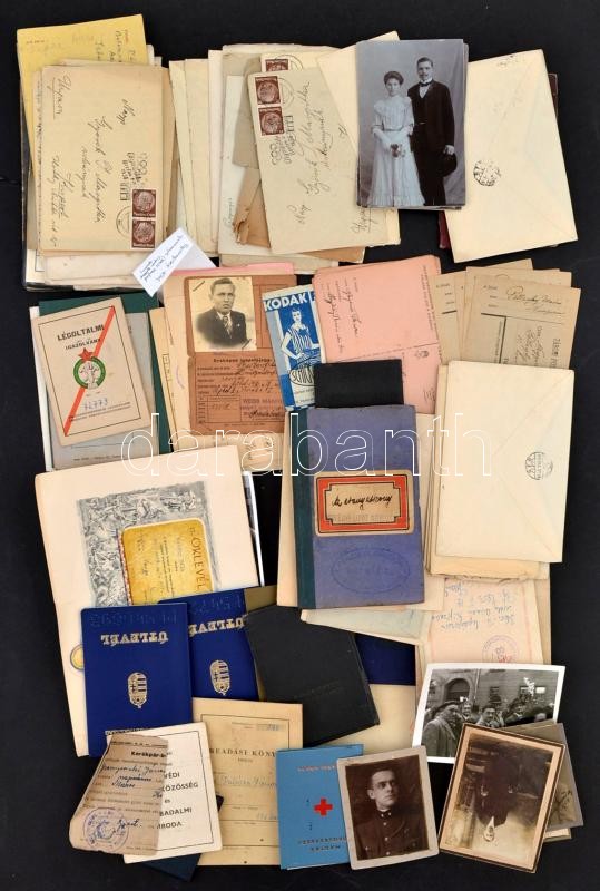 Papírrégiség tétel: Beadási könyv, oklevelek, igazolványok, I. és II. vh tábori posta, leckekönyv, minkakönyv, rendőrség csónaknyilvántartási igazolvány, Kodak film (schik fotó negatívok), levelek, benne Berlini olimpiáról is, útlevelek, katonai igazolványok, szakszervezeti államvasúti, máv igazolvány