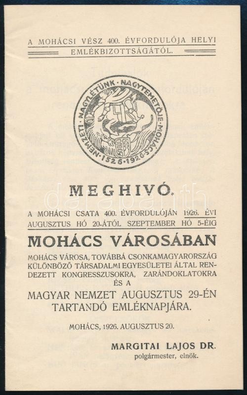 1926 Meghívó a mohácsi csata 400. évfordulóján 1926. évi augusztus hó 20-ától szeptember hó 5-éig Mohács városában Mohács városa, továbbá Csonkamagyarország különböző társadalmi egyesületei által rendezett kongresszusokra, zarándoklatokra és a magyar nemzet augusztus 29-én tartandó emléknapjára. Mohács, Pollák Róbert-ny., 14 p.