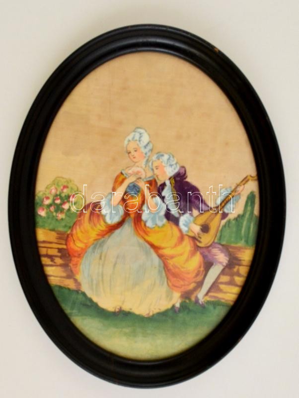 Beschreibung: Barokk szerelmi jelenetet ábrázoló kézzel festett selyemkép fa keretben, 23×16,5 cm
