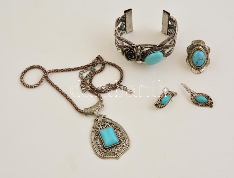 Beschreibung: Türkizzel díszített ékszerek (karperec, fülbevaló, medál, nyaklánc, gyűrű)