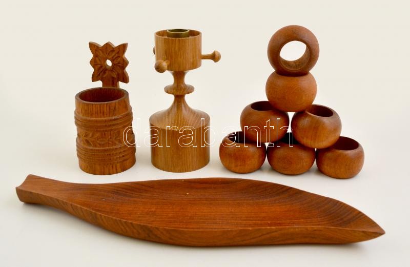 Beschreibung: Vegyes fa tárgyak, gyertyatartó, ceruzatartó, levél alakú dísztál, szalvétagyűrűk, 10 db