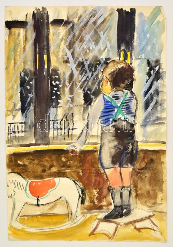 Beschreibung: Jelzés nélkül: Végre havazik. Akvarell, papír, 44×30 cm