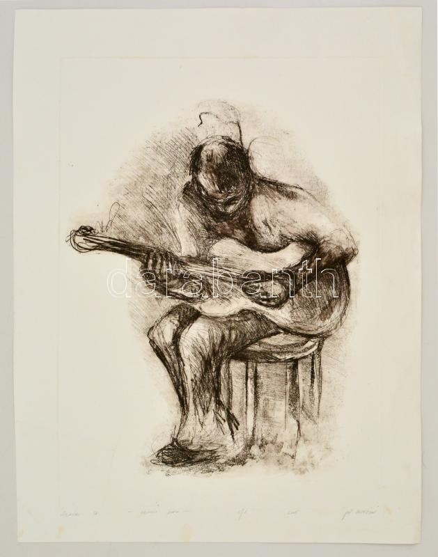 Beschreibung: Pál Zsuzsanna (?-?): Zenész IV., lágyalap, papír, jelzett, számozott (5/8), 48×34,5 cm