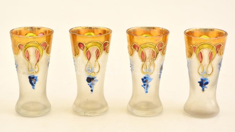 Beschreibung: 4 db díszes üveg kupica, kézzel festett, kopásokkal, m: 6,5 cm