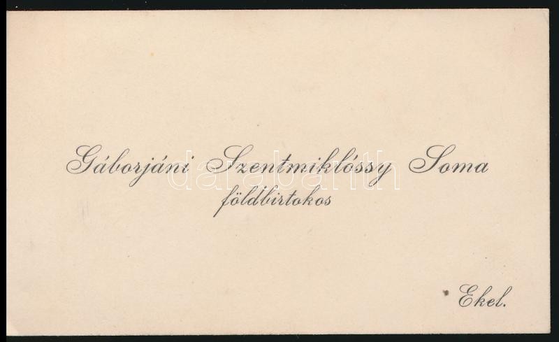 1909 A felvidéki Ekel község földbirtokosának, Gáborjáni Szentmiklóssy Somának névjegye részvétnyilvánítást köszönő soraival