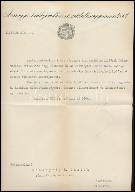 1935 Bp., Hóman Bálint (1885-1951) vallás- és közoktatásügyi miniszter... https://www.darabanth.com/de/325-Fernauktion/325.0/Andere-Sammelgebiete/Historische-Dokumenten-Handschriften~18/1935-Bp-Homan-Balint-1885-1951-vallas-es-kozoktatasugyi-miniszter-alairasa-adomanyt-~II1809093