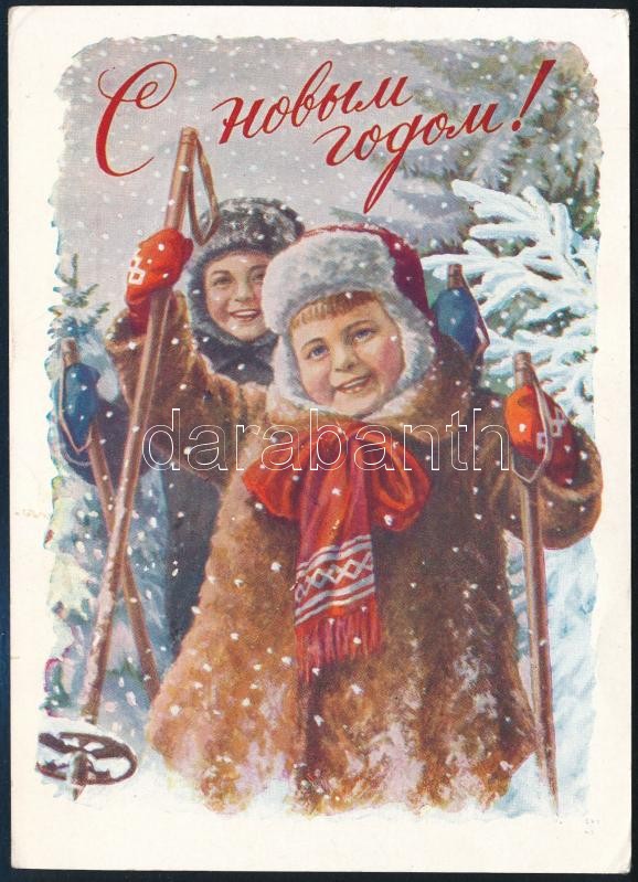 Beschreibung: 1958 Blahó Béla (?-2016) pekingi magyar nagykövet és felesége, Fazekas Borbála részére küldött újévi üdvözlőlap