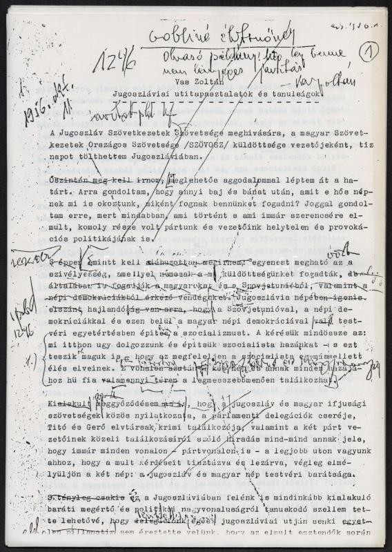 1981-1996 Vas Zoltán (1903-1983) 1956-os államminiszterrel egy jugoszláviai utazásáról szóló írásának korrektúra példánya, valamint feleségének az 56-os intézettel valamint Szakonyi Károllyal, Óvári Miklóssal és a Magvető kiadóval váltott néhány levele