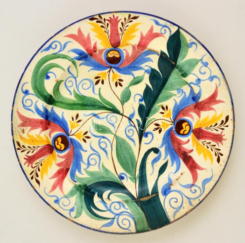 Beschreibung: Miskolc virágmintás kerámia tál, kézzel festett, jelzett, lepattanással, d: 23,5 cm