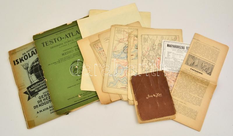 cca 1910-1940 Vegyes térkép tétel, 17 db, változó, többnyire rossz állapotban. Közte: Sopron megye térképe (Franklin-társulat), Párizs és környéke térképe, Magyarország térképe, Dr. Kogutowicz Károly Iskolai atlasza II. Szerk.: Gergely Endre, Dr. Hézser Aurél, Dr. Kogutowicz Károly. Bp., 1934, M. Kir. Állami Térképészet. Papírkötésben, széteső állapotban. Tiszteletpéldány bélyegzéssel a borítón. (Gergely Endre (1885-1938) térképész, m. kir. csendőr százados hagyatékából). Továbbá: Arcangelo Ghisleri: Testo-Atlante di Geografia Storica. Generale E D'Italia In Particolare. Fascicolo Unico Medio Evo. Bergamo, 1934, Istituto Italiano D'Arti Grafiche. Olasz nyelven. Kiadói papírkötés, a borítója leszakadt.
