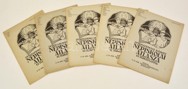 cca 1925 Dr. Kogutowicz Károly: Népiskolai atlasza. I-V. szám. Bp., M. Kir. Állami Térképészet, 12+12+12+12+12 p. A bortón cserkész témájú illusztrációval.