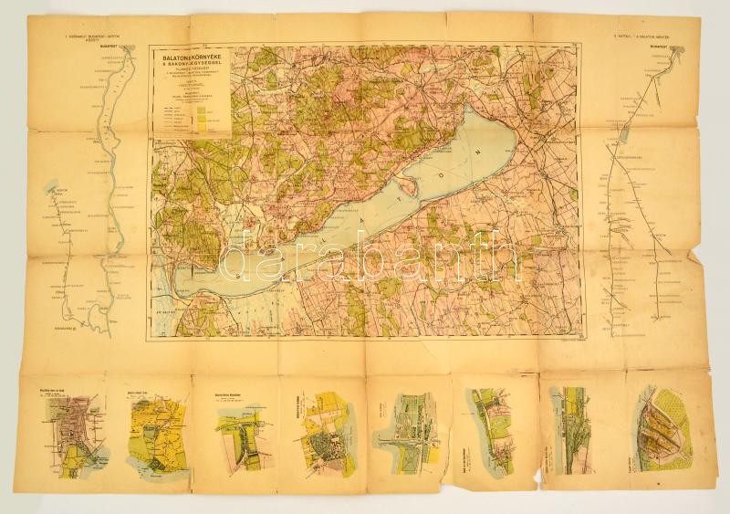 cca 1930 Balaton és környéke térkép a Bakony hegységgel. Szélén a környező települések és utak képével. Heidt Dániel 100x68 cm Megviselt állapotban, hajtásoknál ragasztva