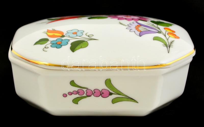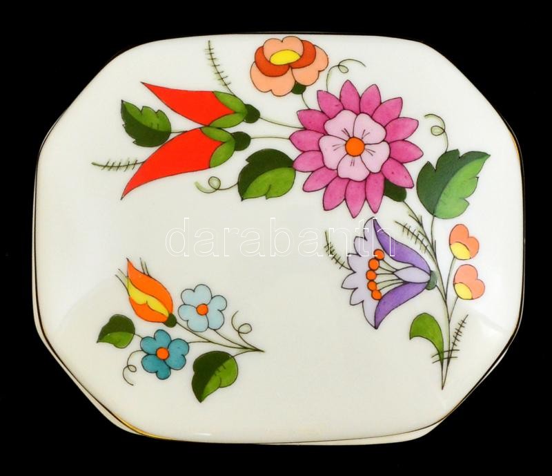 Beschreibung: Kalocsai bonbonier, kézzel festett, jelzett, apró kopásokkal, saját dobozában, 12,5×10,5×5 cm
