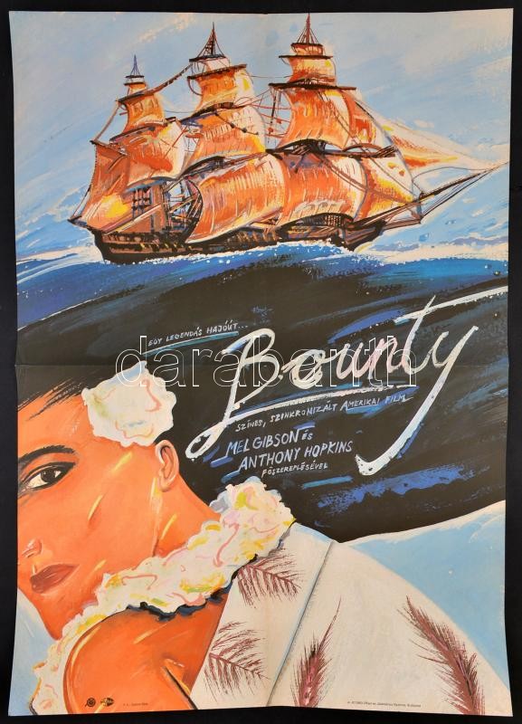 1987 Rácmolnár Sándor (1960 - ): Bounty, amerikai film plakát, főszerepben: Mel Gibson, Antony Hopkins, ofszet, hajtásnyomokkal, 81x56,5 cm / The Bounty movie, Hungarian poster, ofset, folded, 81x56,5 cm