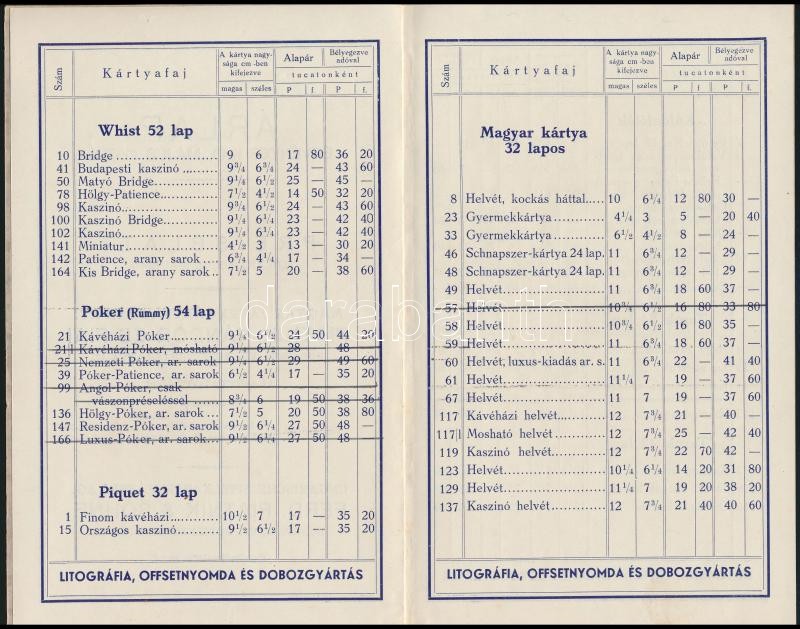 1940 Magyar Játékkártyagyár Rt. Piatnik Nándor és fiai árjegyzék, tűzö... https://www.darabanth.com/de/325-Fernauktion/325.0/Andere-Sammelgebiete/Werbungen~21/1940-Magyar-Jatekkartyagyar-Rt-Piatnik-Nandor-es-fiai-arjegyzek-tuzott-papirkotesben~II1809092