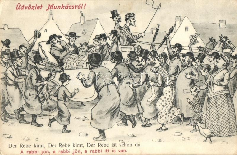 Üdvözlet Munkácsról! A rabbi jön, a rabbi jön, a rabbi itt is van! Judaika, humor. S. M. P. Kraków Deposé 1909. 10. / Der Rebe kimt, der Rebe kimt, der Rebe ist schon da! / Greetings from Mukacevo! The rabbi is coming, the rabbi is coming, the rabbi is here! Judaica, humour (EK)