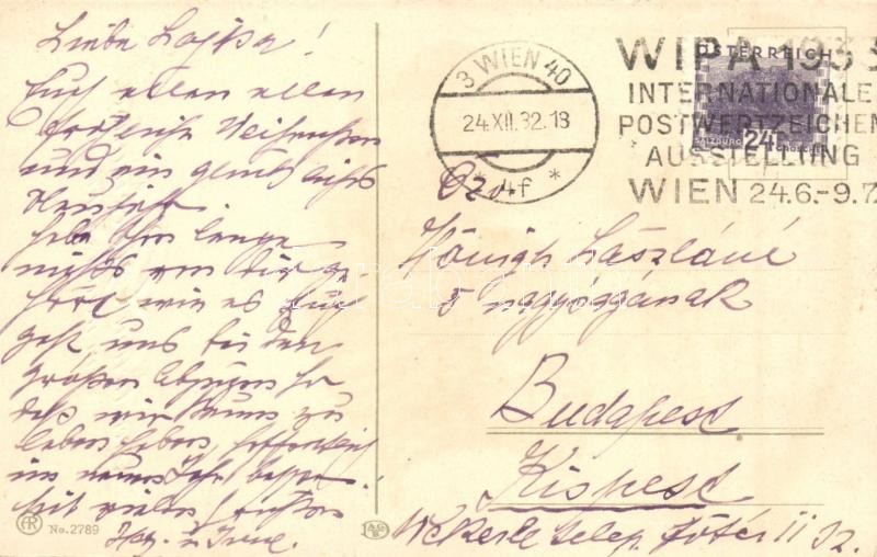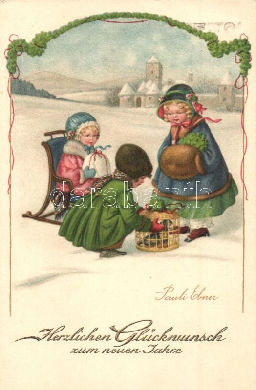 Herzlichen Glückwunsch zum neuen Jahre / New Year greeting art postcard, children in the snow with little dog. AR. No. 2789. s: Pauli Ebner + 1933 WIPA Wien Internationale Postwertzeichen Ausstellung So. Stpl. (EK)