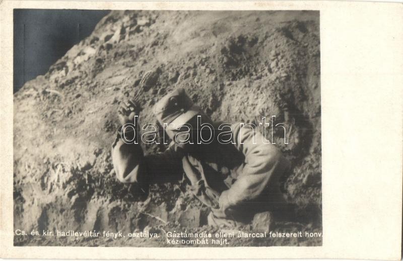 Gáztámadás elleni álarccal felszerelt honvéd kézibombát hajít. Cs. és kir. hadilevéltár fényk. osztálya. Hadifénykép Kiállítás / WWI Hungarian military, soldier wearing a mask throwing a hand bomb