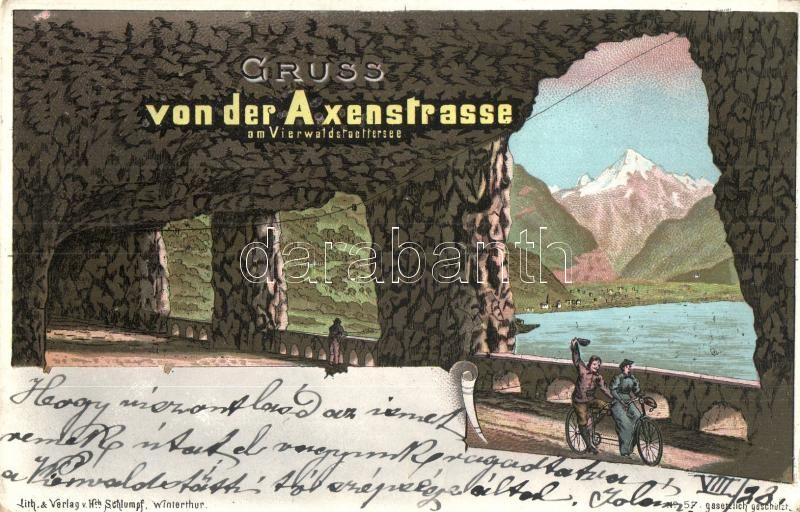 Beschreibung: Vierwaldstättersee, Axenstrasse und Bristenstock / road between Brunnen and Flüelen, cyclist, lake, alle, litho (EK)