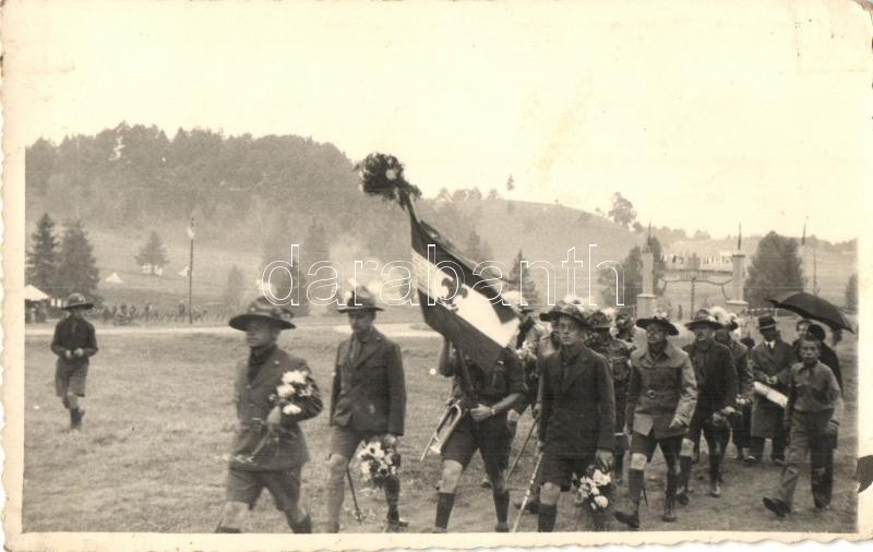 1916 Brassópojána, Pojána, Schulerau, Poiana Brasov; cserkészek felvon... https://www.darabanth.com/de/325-Fernauktion/325.0/Ansichtskarten/Siebenburgen~2500005/1916-Brassopojana-Pojana-Schulerau-Poiana-Brasov-cserkeszek-felvonulasa-zaszloval-boy-s~II1811393