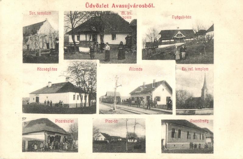Avasújváros, Ioaras, Orasu Nou; Izraelita templom, zsinagóga, M. kir. posta, Nyáguli ház, Községháza, Vasútállomás, vasutasok, Református templom, Piac, üzlet, Csendőrség / synagogue, post office, villa, town hall, railway station, railwaymen, Calvinist church, market, shops, gendarmerie (EK)