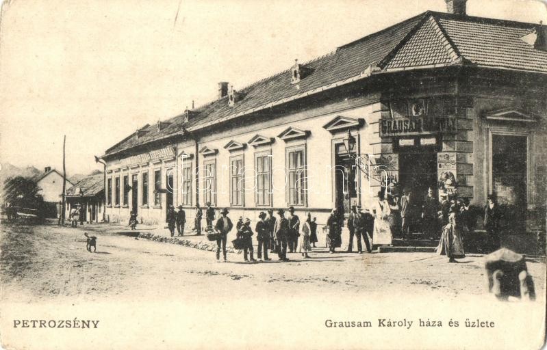 Petrozsény, Petrosani; Grausam Károly háza és üzlete, bor és sörcsarnoka. Grausam Károly saját kiadása / publisher's shop front and beer hall (kopott sarkak / worn corners)
