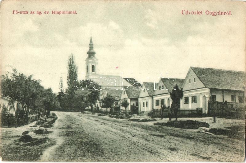 Beschreibung: 1917 Osgyán, Ozdany; Fő utca, Ágostai evangélikus templom / main street with church