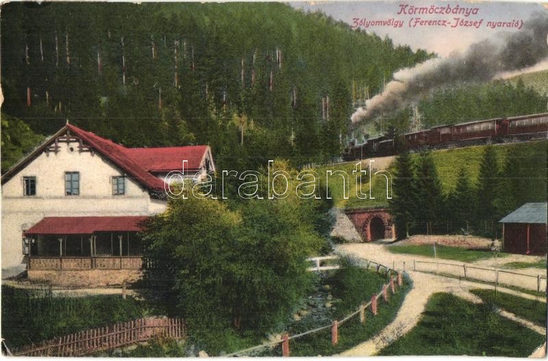 Beschreibung: Körmöcbánya, Kremnitz, Kremnica; Zólyomvölgy, Ferenc József nyaraló, gőzmozdony. Ritter Sándor kiadása / Zvolenska dolina, villa, locomotive (EK)
