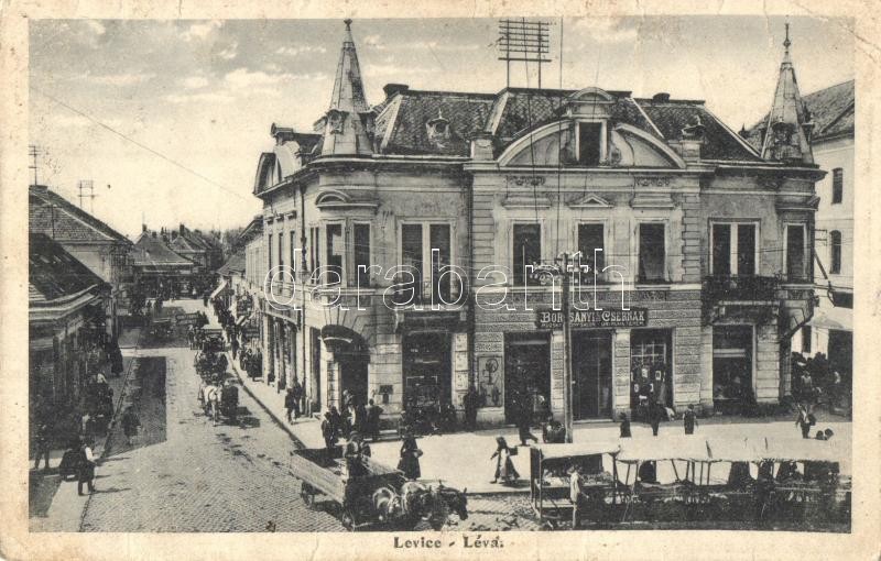 Beschreibung: Léva, Levice; tér, utca, Borcsányi és Csernák úri ruha terme, piaci árusok / square, shops, market vendors (EK)