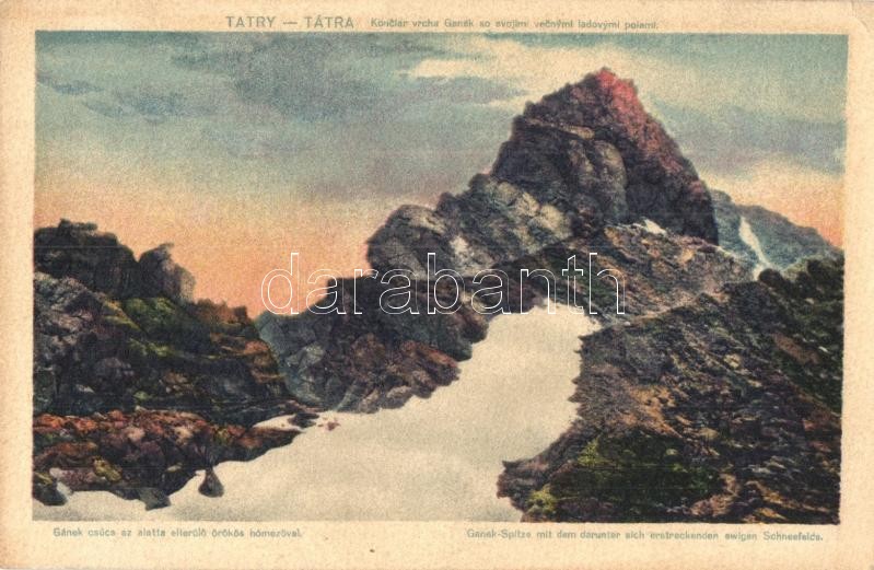 Tátra, Gánek-csúcs az alatta elterülő örökös hómezővel / mountain peak... https://www.darabanth.com/de/325-Fernauktion/325.0/Ansichtskarten/Slowakei~2500006/Tatra-Ganek-csucs-az-alatta-elterulo-orokos-homezovel-mountain-peak-with-eternal-snow-~II1726396