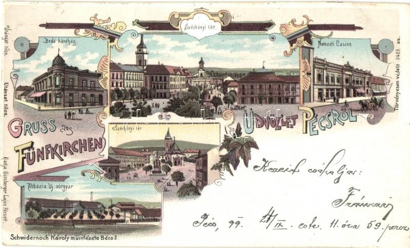 1899 Pécs, Bedő kávéház, Széchenyi tér, nemzeti Kaszinó, Abbazia új sö... https://www.darabanth.com/de/325-Fernauktion/325.0/Ansichtskarten/Ungarn~2500004/1899-Pecs-Bedo-kavehaz-Szechenyi-ter-nemzeti-Kaszino-Abbazia-uj-sorgyar-Schwidernoch~II1788661