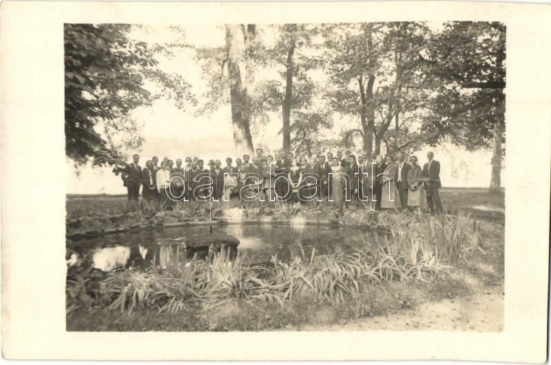 Beschreibung: 1925 Tatatóváros, Gróf Esterházy kertjében a szökőkút mellett, háttérben tó, csoportkép. photo