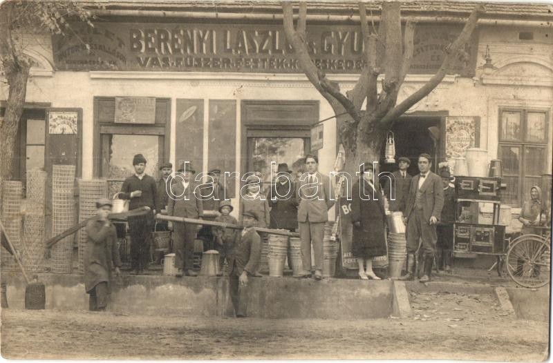 Beschreibung: 1928 Újkécske, Tiszakécske; Berényi László és Gyula vas, fűszer és festék kereskedése, csoportkép. photo