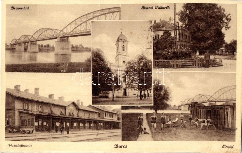 Barcs, Dráva híd, Takarék, strand, vasútállomás, templom https://www.darabanth.com/de/325-Fernauktion/325.0/Ansichtskarten/Ungarn~2500004/Barcs-Drava-hid-Takarek-strand-vasutallomas-templom~II1807826