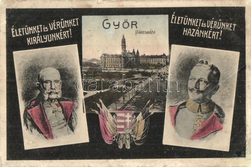 Győr, Városháza. "Életünket és vérünket királyunkért! Életünket és vérünket hazánkért!" Viribus Unitis propaganda, Ferenc József, II. Vilmos német császár, címer (r)