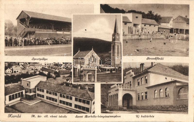 Beschreibung: Komló, Sportpálya, M. kir. állami elemi iskola, új kultúrház, strandfürdő, Szent Borbála bányásztemplom