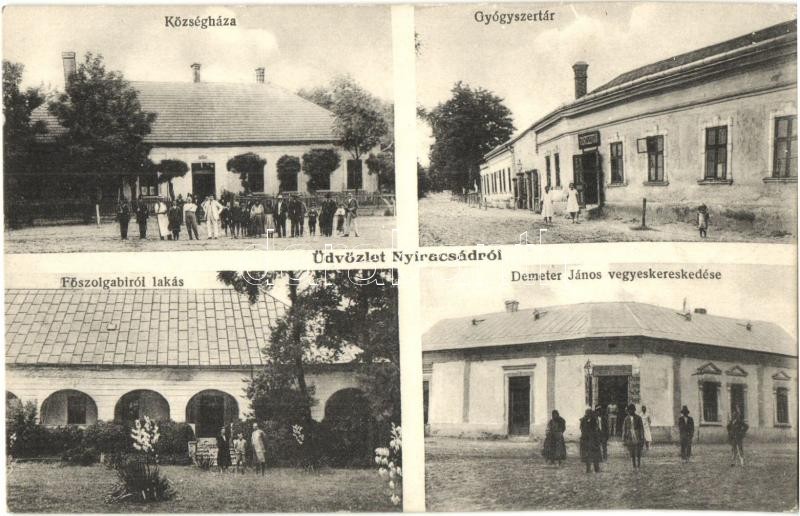Nyíracsád, Községháza, gyógyszertár, Főszolgabírói lakás, Demeter Jáno... https://www.darabanth.com/de/325-Fernauktion/325.0/Ansichtskarten/Ungarn~2500004/Nyiracsad-Kozseghaza-gyogyszertar-Foszolgabiroi-lakas-Demeter-Janos-vegyeskereskede~II1810188