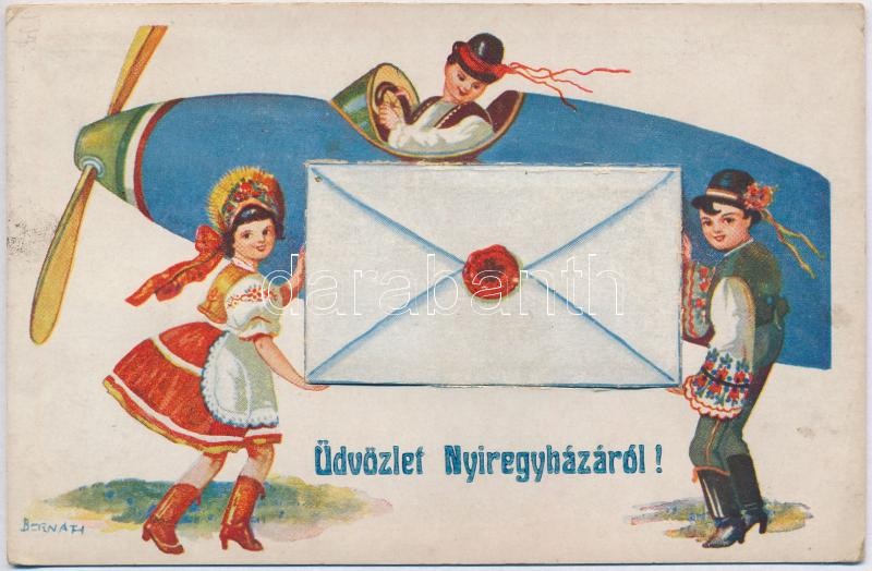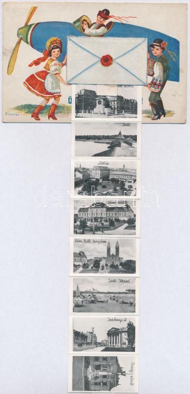 Beschreibung: Nyíregyháza, népviseletes folklór leporellólap, belül: Sóstó szálloda, strand fürdő, Hősök szobra, Országzászló, Városháza, stb. s: Bernáth (EK)