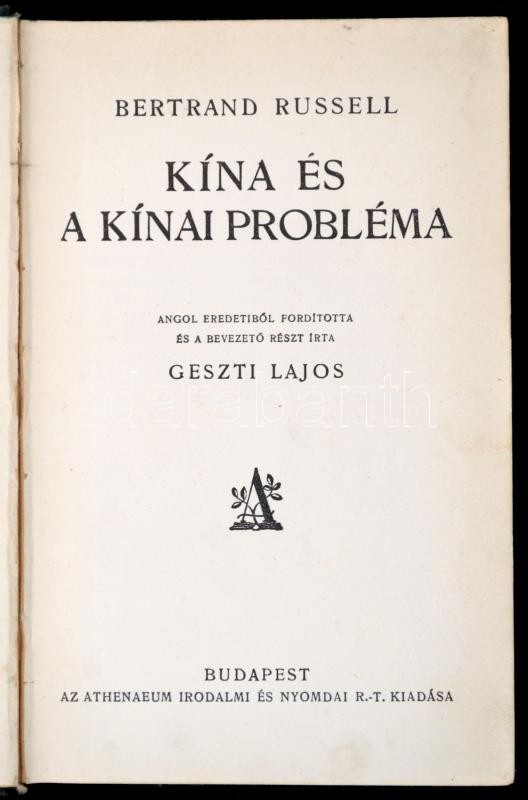 Bertand Russell: Kína és a kínai probléma. Angol eredetiből fordította és a bevezető részt írta: Geszti Lajos. Bp., (1932), Athenaeum Irodalmi és Nyomda Rt. Kiadói egészvászon kötésben. A fordító dedikációjával!