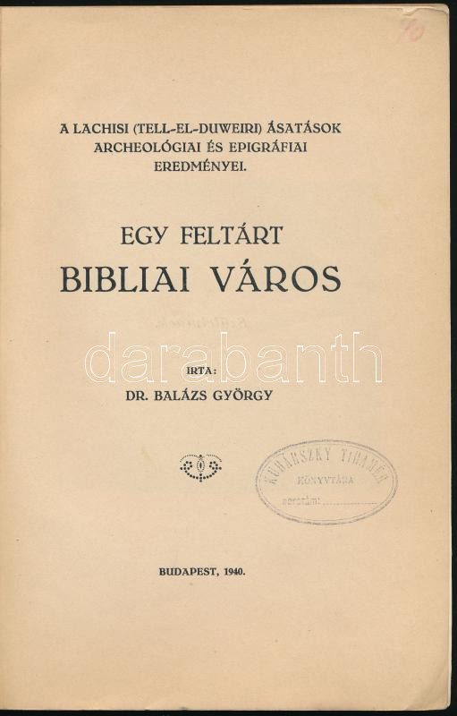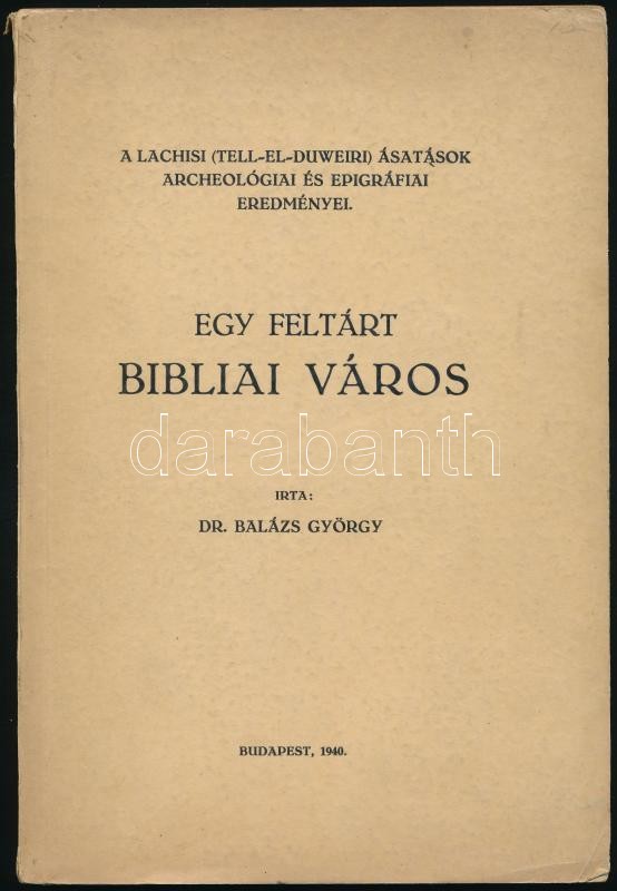 Dr. Balázs György: Egy feltárt bibliai város. A lachisi (tell-el-duweiri) ásatások archeológiai és epigráfiai eredményei. Vác,1940,Berger-ny.,1 t.+115+1 p. Kiadói papírkötés. Kuhárszky Tihamér (1897-1971) egyiptológus névbélyegzőjével.