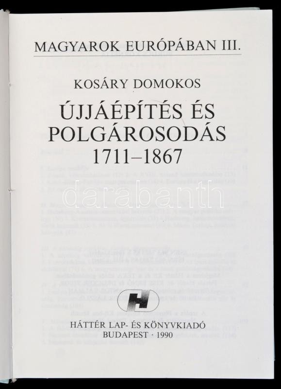 Kosáry Domokos: Újjáépítés és polgárosodás 1711-1867. Magyarok Európában III. Bp.,1990, Háttér. Kiadói kartonált papírkötés, kiadói papír védőborítóban, jó állapotban.