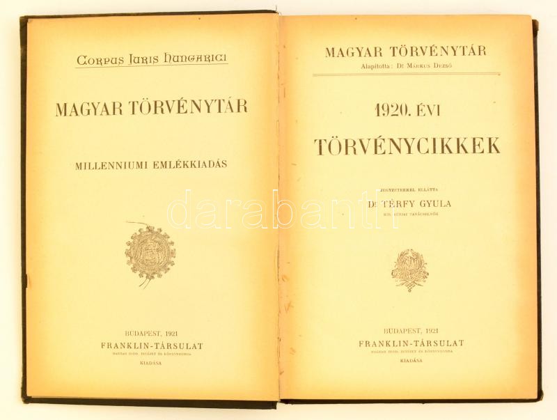 1920. évi törvénycikkek. Jegyzetekkel ellátta: Dr. Térfy Gyula. Corpus Juris Hungarici. Magyar Törvénytár. Milleniumi Emlékkiadás. Bp., 1921, Franklin, VI+2+314 p. Kiadói félvászon-kötés, kopottas borítóval, kissé sérült gerinccel.